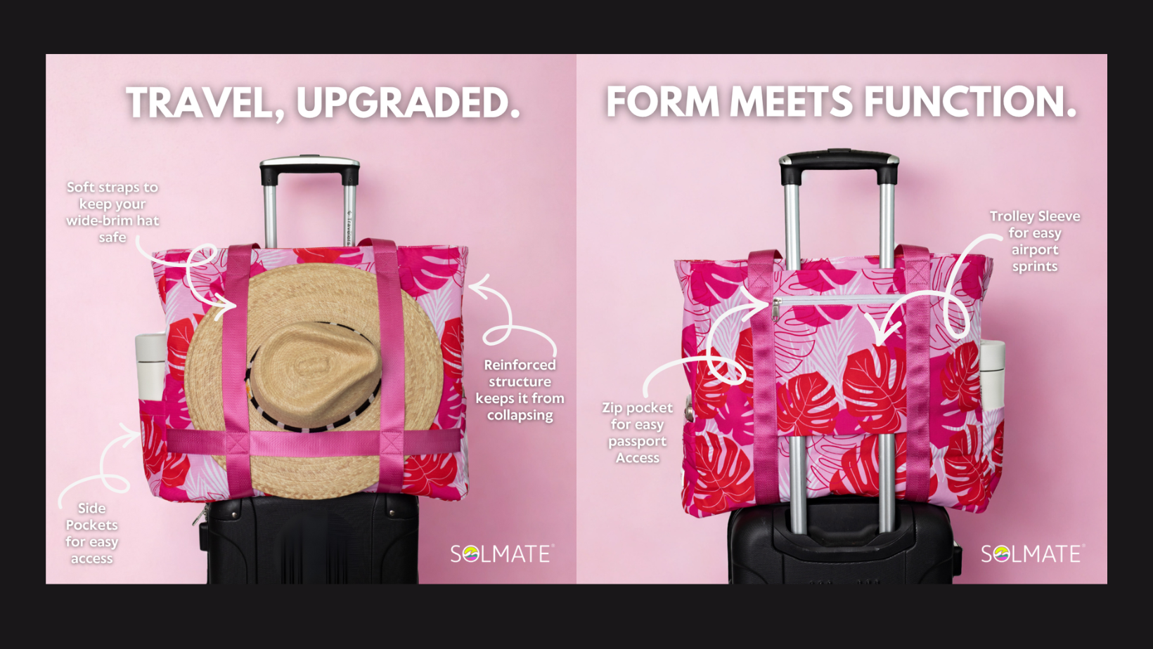 Thoughtfully designed for women who love sun, style, and connection, the SOLMATE Travel Tote features a built-in hat holder, trolley sleeve, and spacious compartments—perfect for weekend getaways, beach days, and jet-set adventures. Whether you’re packing for a romantic escape or a girls’ trip, this versatile carry-on tote bag keeps your essentials organized and your hat protected in style. More than a bag—it’s a statement of intentional travel.
